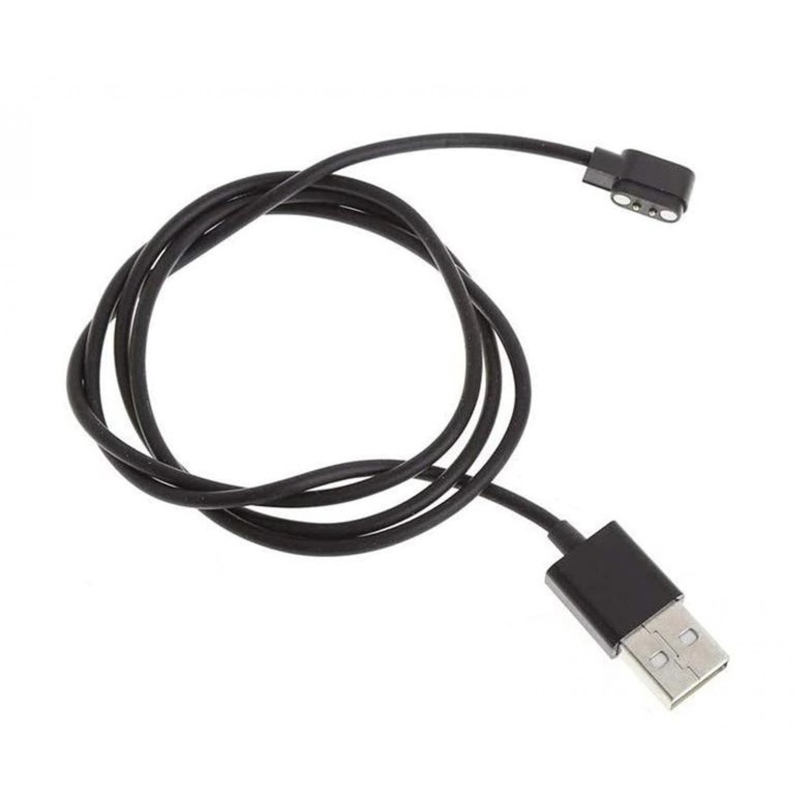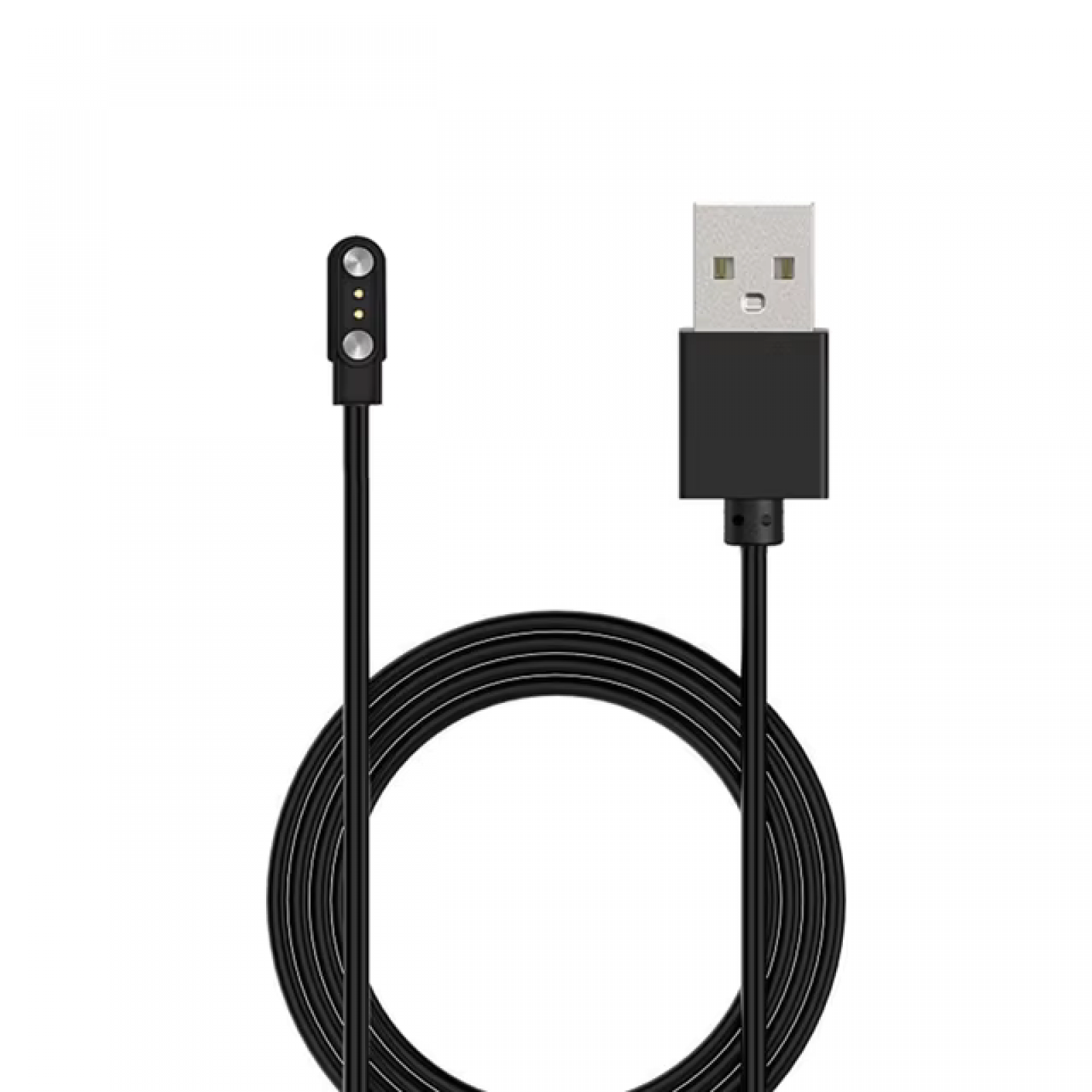 Магнитный зарядный USB кабель для смарт-часов, черного цвета, длиной 80 см. С одной стороны USB Type A, а с другой 2 магнитные коннектора, расстояние между которыми 2.5 мм.