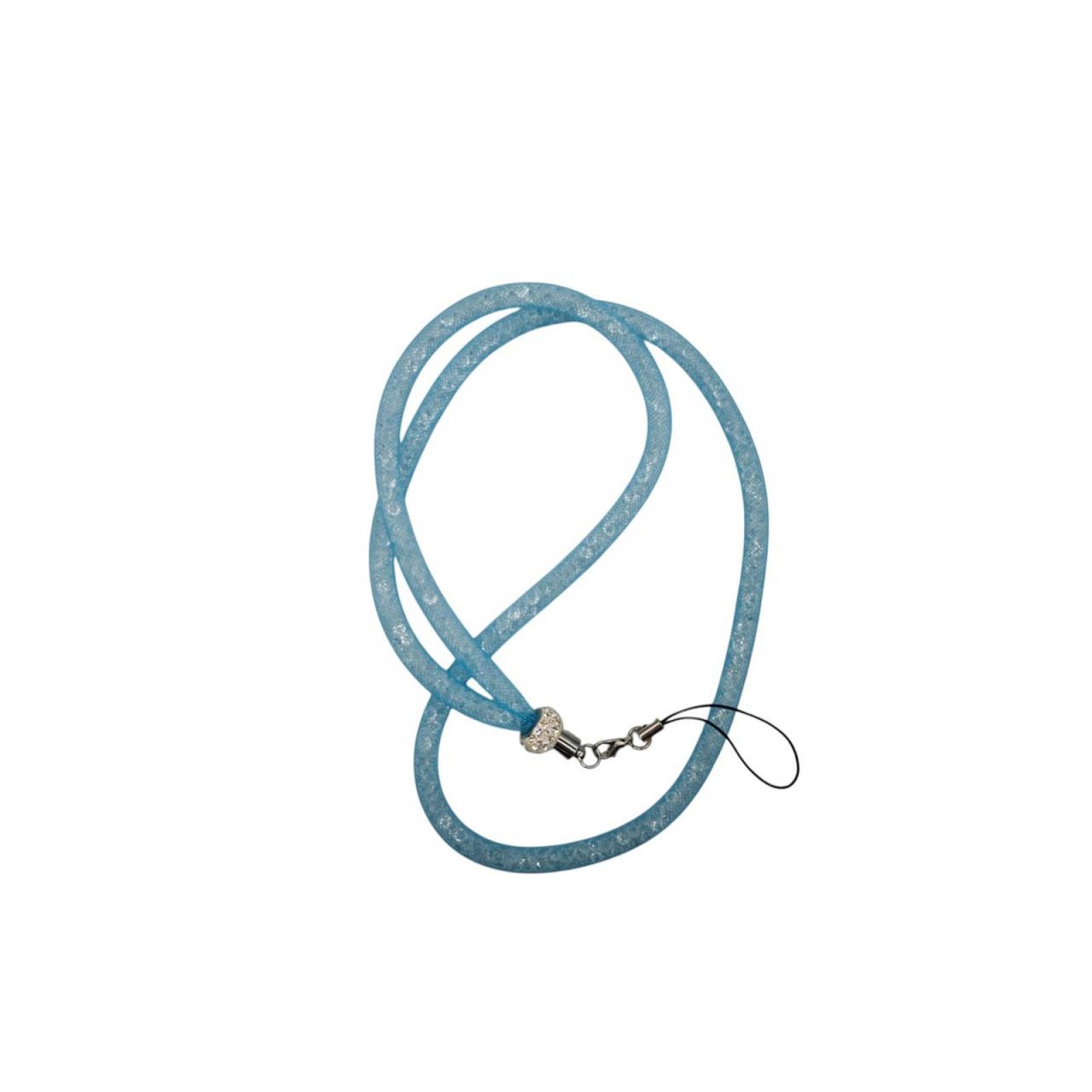 Шнурок на шию для телефону для носіння телефону, смартфону та інших дрібних речей. Наповнення - штучні камінці. Оболонка виготовлена із волосіні. Колір - блакитний. Товщина - 6 мм. Довжина - 47 см. (разом із кріпленням для телефону).